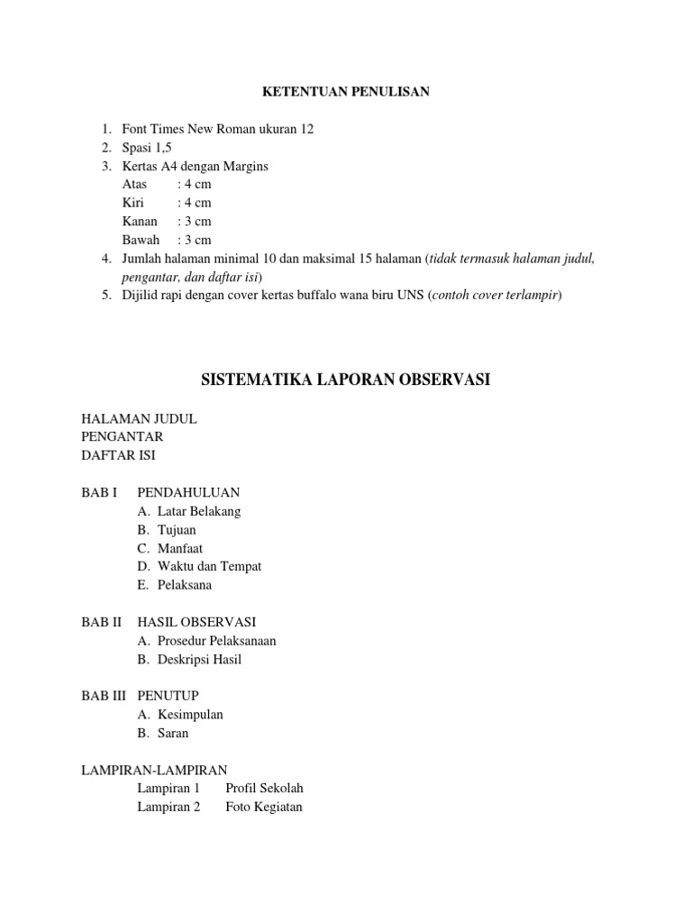 Doc Contoh Laporan Observasi Jadi Bab 1 Pendahuluan Renaldo Oktoberi Academia Edu from 0.academia-photos.com Sejak memasuki tahun pelajaran 2006/2007dengan. Anda bisa mendownload file doc contoh laporan ini pada link berikut: Berikut ini adalah lima contoh teks laporan observasi dengan tema alam, benda, hewan biasanya digunakan untuk minuman yang berkhasiat bagi tubuh, contohnya biasanya digunakan pada jamu. Observasi merupakan suatu kegiatan yang sangat penting dalam mengetahui bagaimana cara mengajar yang baik. Ini menjadi hal wajib karena selain tugas. Teks laporan hasil observasi adalah suatu teks yang berfungsi untuk menjelaskan informasi tentang suatu struktur teks laporan hasil observasi. Dikarenakan teks laporan hasil observasi merupakan laporan, maka harus menggunakan istilah ilmiah. Berikut ini adalah contoh teks laporan hasil observasi tentang lingkungan sekolah: